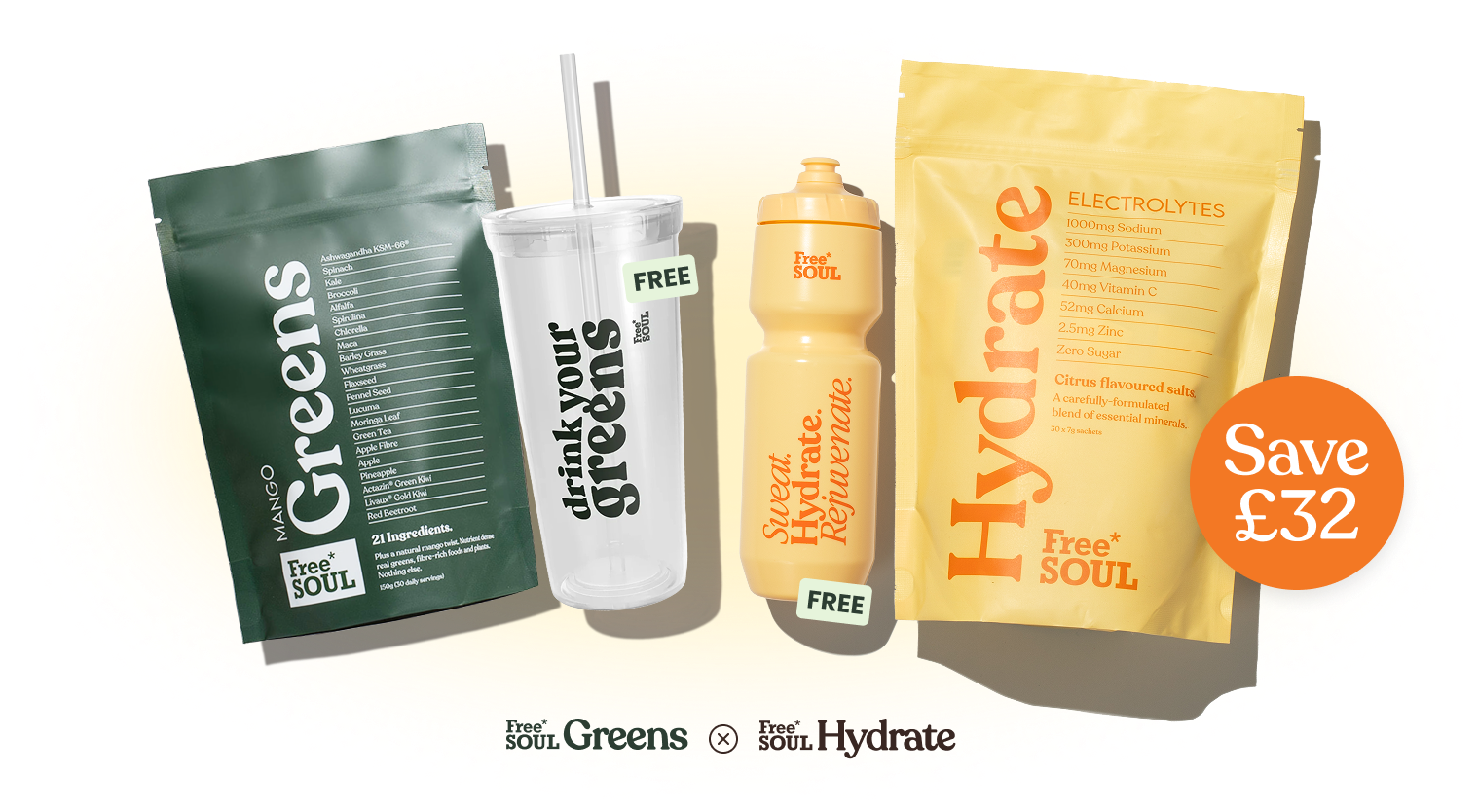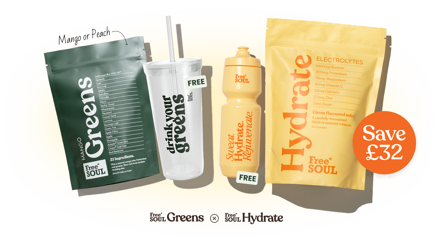 Free Soul Greens and Hydrate are your new daily essentials. Free Soul Greens delivers 21 daily superfoods, while Hydrate supports electrolyte replenishment and elevates your wellbeing. A Refresh Bundle made just for women.