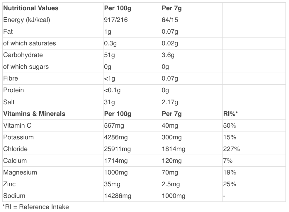 Sodium Chloride, Citric Acid, Potassium Chloride, Magnesium Malate, Tri-Calcium Citrate, Calcium L-Ascorbate (Vitamin C), Zinc Citrate, Natural Flavouring, Steviol Glycosides (Sweetener).