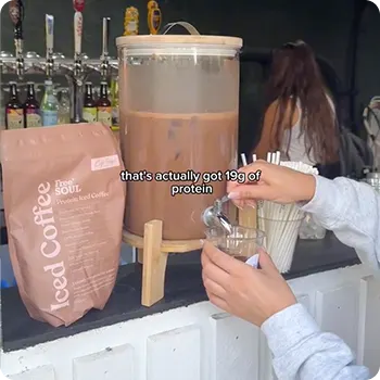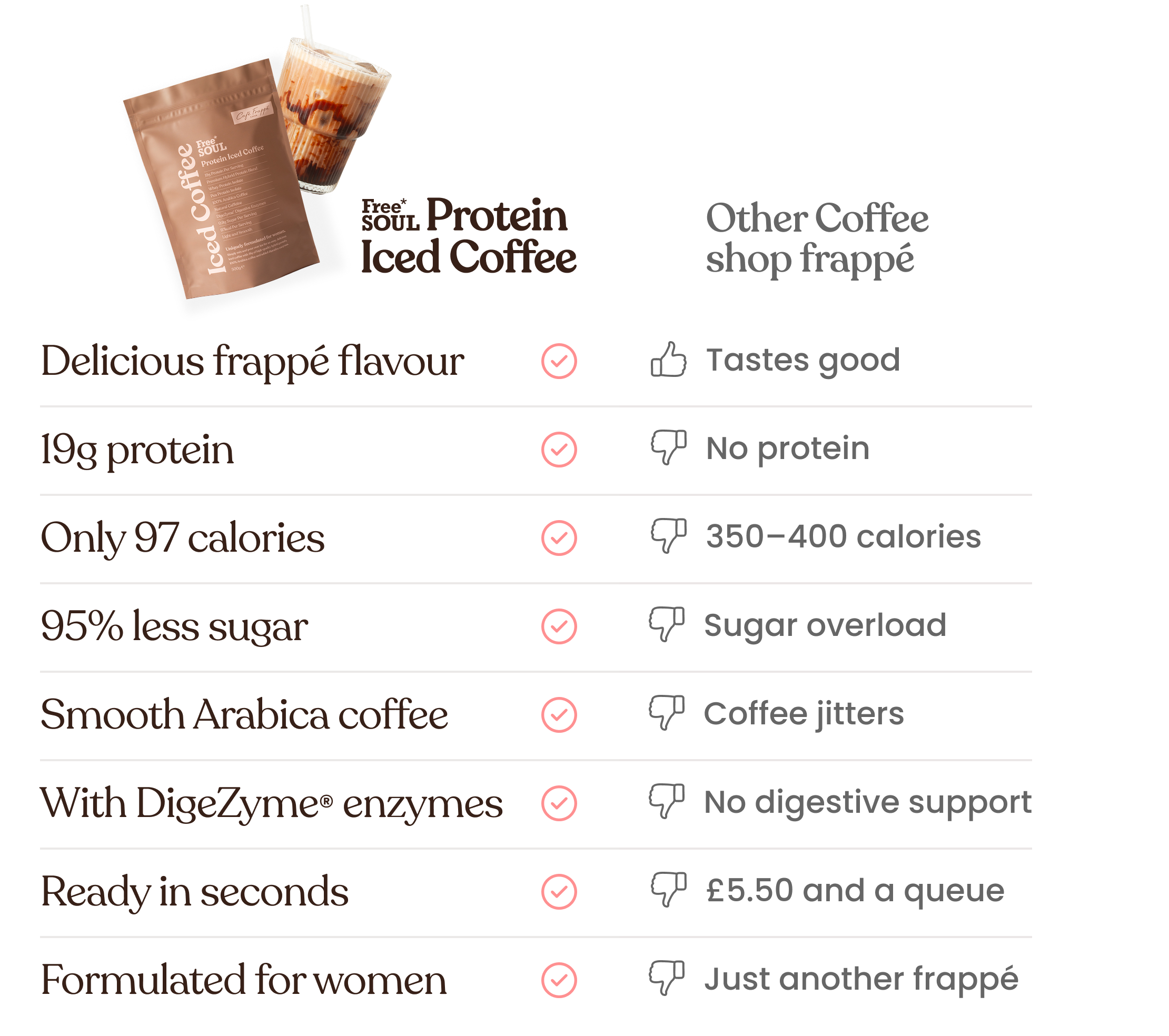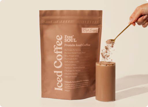 Sometimes referred to as ‘proffee’, Free Soul Protein Iced Coffee is a delicious, caffeinated protein drink. Blended with premium Arabica coffee, natural cacao and delivering 19g of protein, 97 calories and 95% less sugar than your regular coffee shop frappé*. It’s your go-to iced coffee that gives you the daily indulgence you deserve, with the nutrients you need.